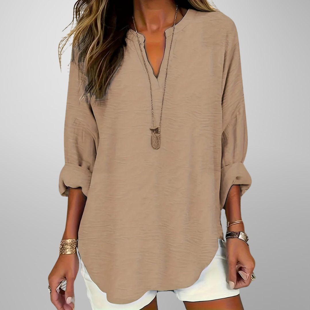 Discover timeless style and everyday comfort with Skye – V-Neck Blouse with Long Sleeves. This beautifully crafted V-neck blouse is a wardrobe staple you’ll find yourself reaching for again and again. Designed to flatter with a relaxed silhouette and graceful detailing, it adds a touch of sophistication to any outfit. Whether you're dressing up or keeping it casual, it delivers the perfect balance of comfort and chic.